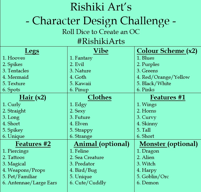 I love designing original characters (OC’s) but sometimes I struggle to come up with ideas. I made this dice challenge as a fun way to counteract that.